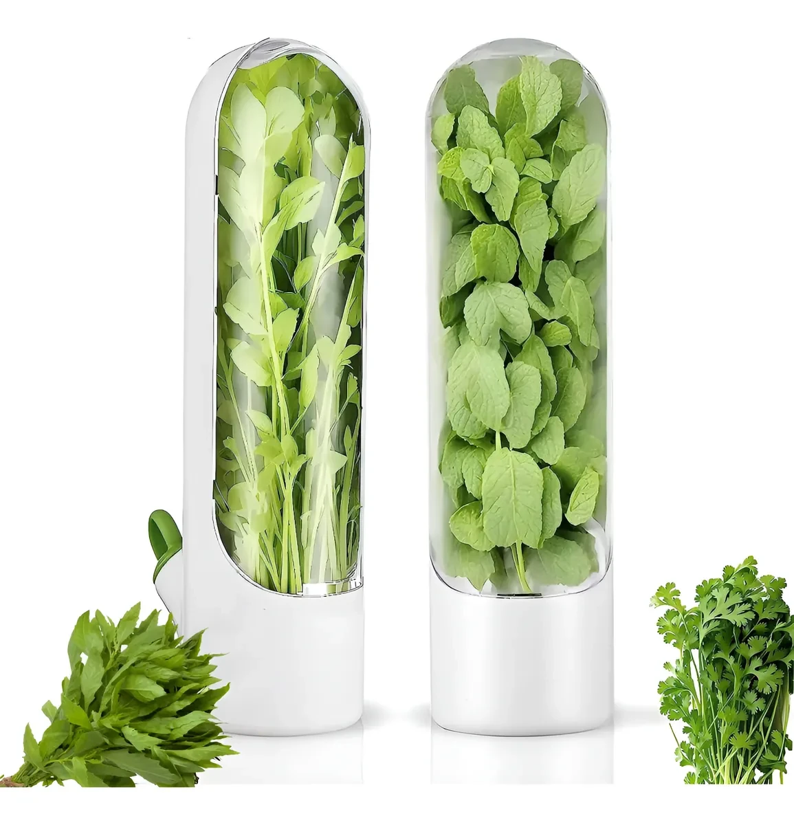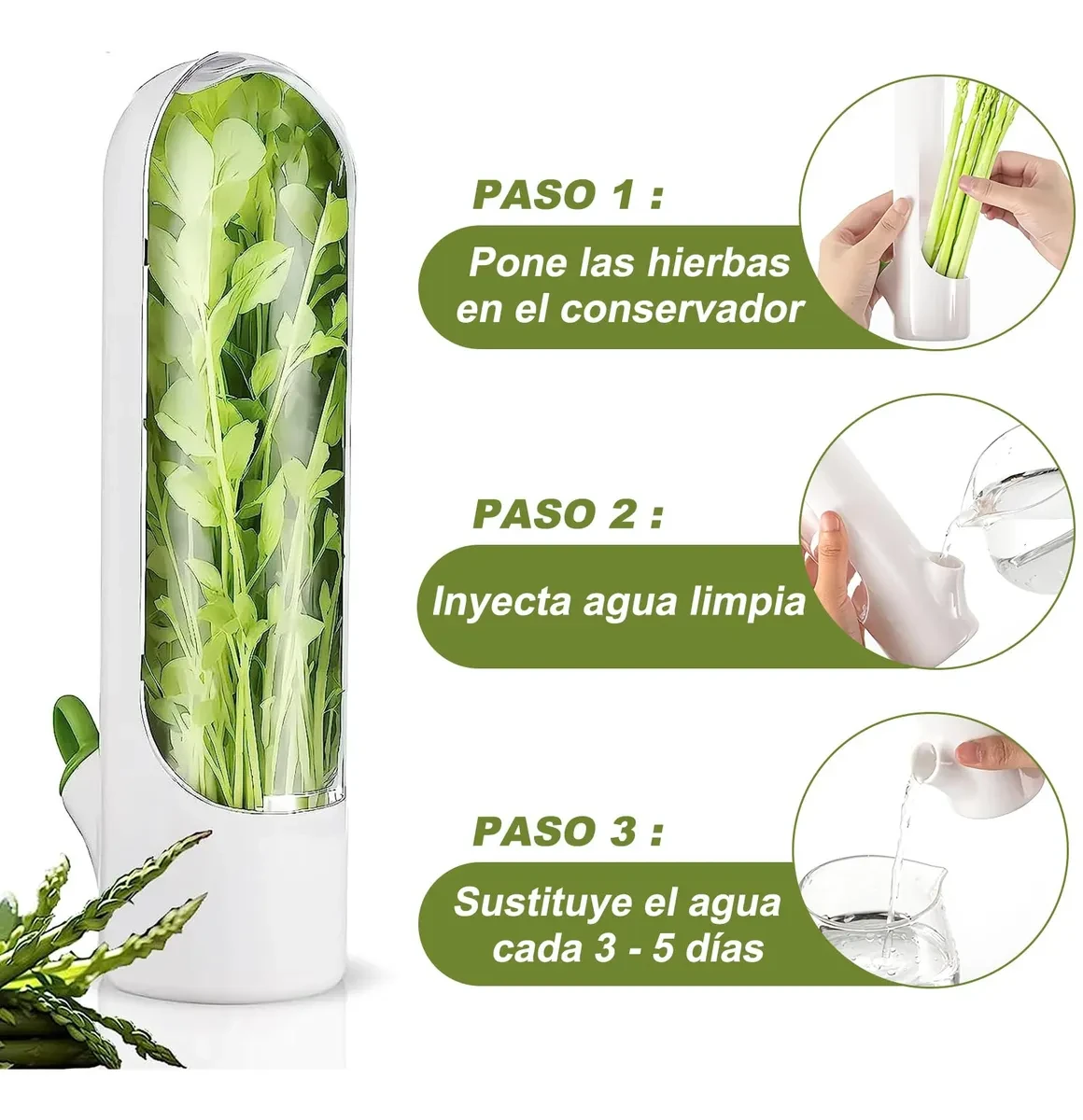 Simple de usar: colocás las hierbas en el interior, inyectás agua limpia en la base y la renovás cada 3 a 5 días. Ideal para perejil, cilantro, albahaca, romero y más. Su diseño compacto se adapta fácilmente a cualquier rincón de la heladera o mesada.
