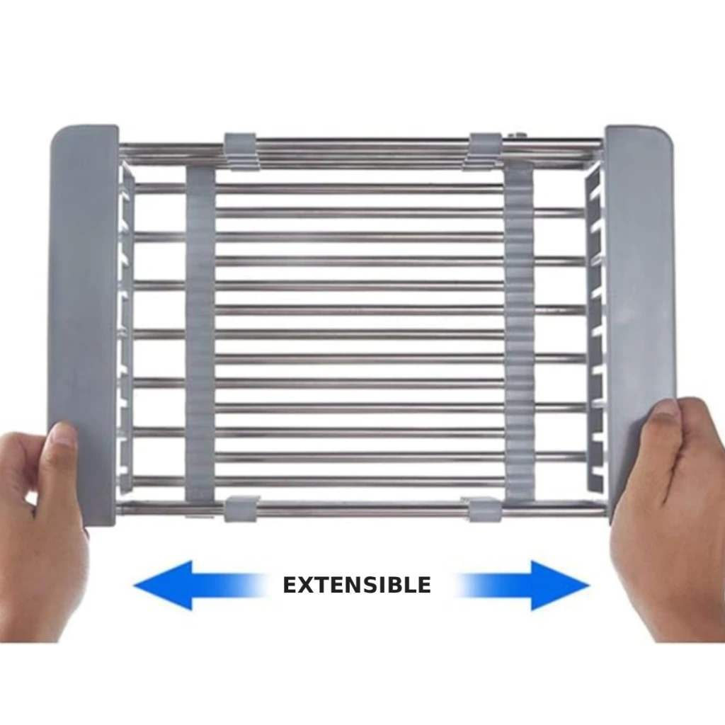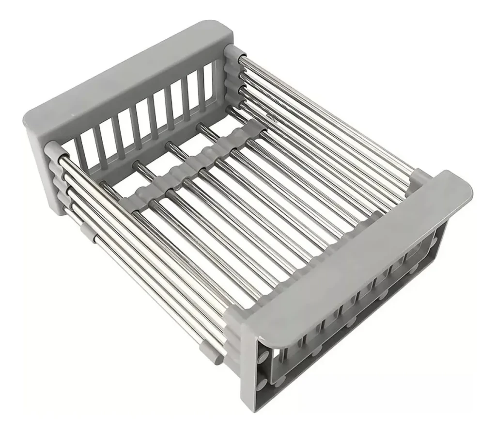 Fabricado con varillas metálicas y soportes laterales de plástico resistente, combina funcionalidad y diseño moderno. Su sistema extensible permite ajustarlo fácilmente al ancho de tu bacha, y su estructura abierta favorece el drenaje rápido.