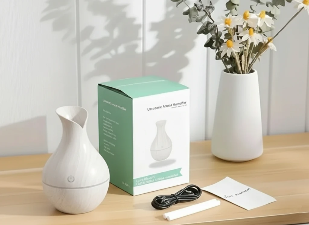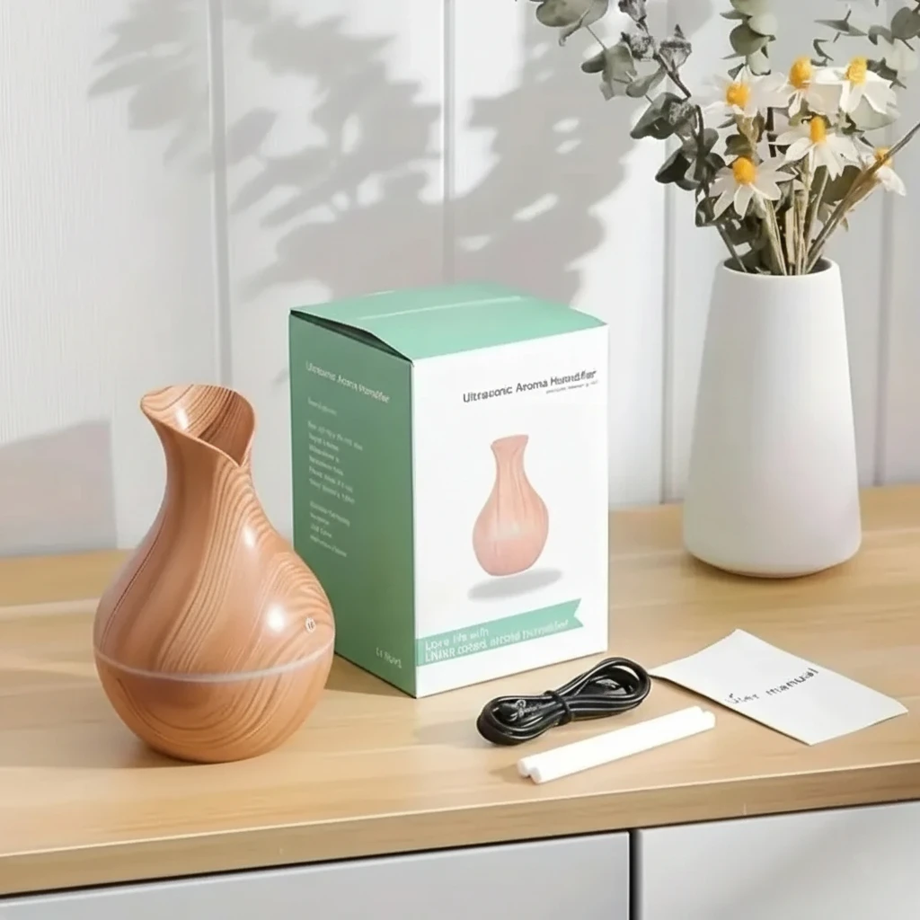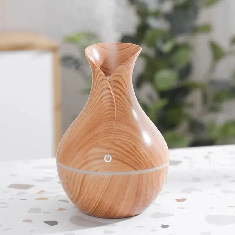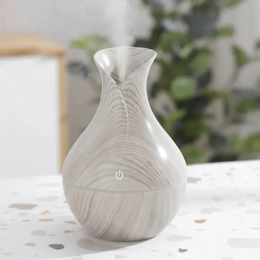 Este humidificador difusor ultrasónico de 130 ml es perfecto para crear ambientes relajantes y saludables. Su diseño tipo madera con forma de florero aporta calidez y estilo a cualquier rincón del hogar u oficina. Funciona mediante tecnología ultrasónica que convierte el agua en una fina niebla, ideal para mejorar la humedad ambiental y dispersar aceites esenciales.