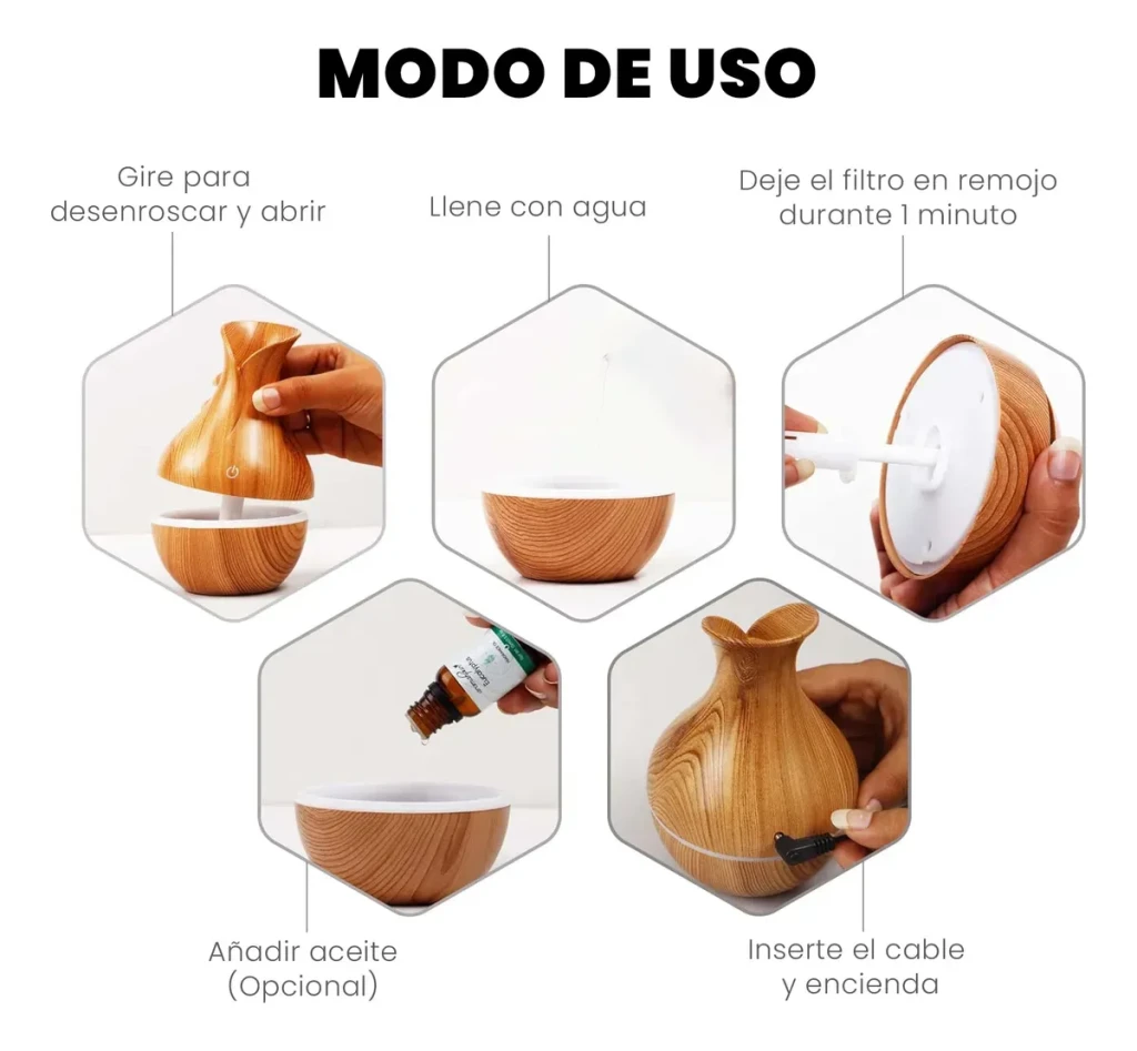 Su uso es simple: se desenrosca la tapa, se llena con agua, se deja el filtro en remojo por 1 minuto, se añade aceite esencial (opcional) y se conecta mediante cable USB. Su funcionamiento silencioso lo hace ideal para dormitorios, escritorios o espacios de descanso.