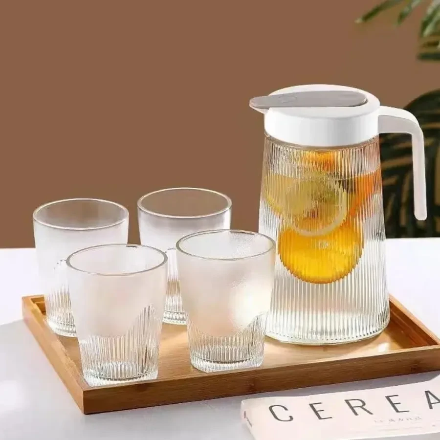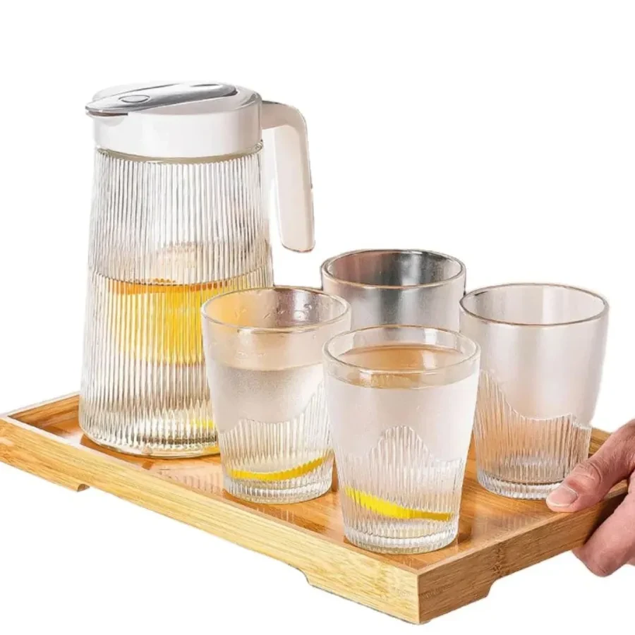 Este set de jarra de vidrio labrada con 4 vasos es ideal para servir tus bebidas favoritas con estilo y funcionalidad. La jarra, de diseño texturado y tapa con pico vertedor, tiene una capacidad de 1.3 litros, perfecta para agua saborizada, jugos, limonadas o cócteles. Los vasos a juego, con capacidad de 270 ml aprox., complementan la presentación con un toque fresco y moderno.
