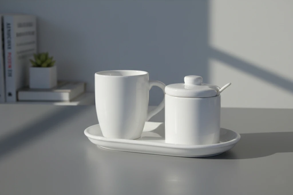 Este juego de cerámica blanco es una propuesta sobria y funcional para quienes valoran el diseño limpio y los detalles bien pensados. Incluye una taza mug bombe blanca, una azucarera recta con tapa, una bandeja oval y una cuchara de porcelana, todo en tonos blancos que se adaptan a cualquier estilo de mesa o ambiente.