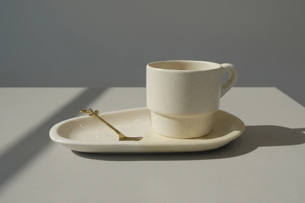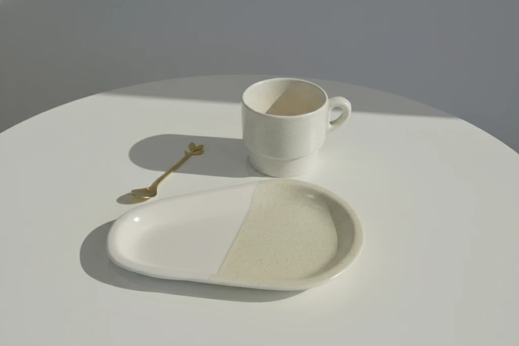 La taza tiene un formato cómodo y equilibrado, perfecta para café, té o infusiones. La bandeja bicolor en forma de gota permite presentar el desayuno con elegancia, y la cuchara corta con mango en forma de hoja añade un detalle único y decorativo.