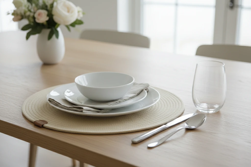 Su diseño tejido en tono neutro aporta textura y calidez, adaptándose a distintos estilos decorativos: rústico, moderno, minimalista o natural. Ideal para cenas, eventos especiales o uso diario, este plato de sitio no solo embellece tu mesa, sino que también organiza visualmente cada lugar.